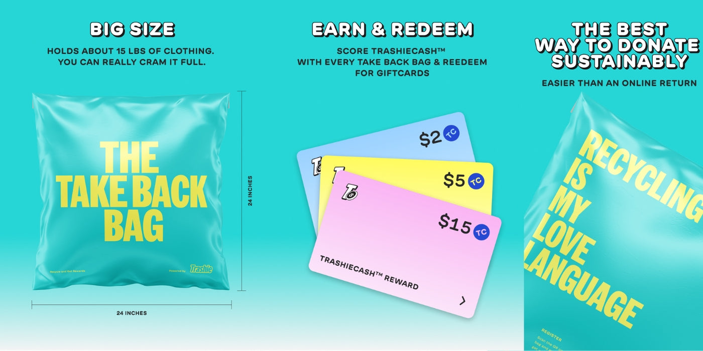 Donate sustainably. Get rewarded. Send trashio.io your unwanted clothes, shoes, handbags, accessories, and home textiles and earn TrashieCash™ back for every Take Back Bag you return.
